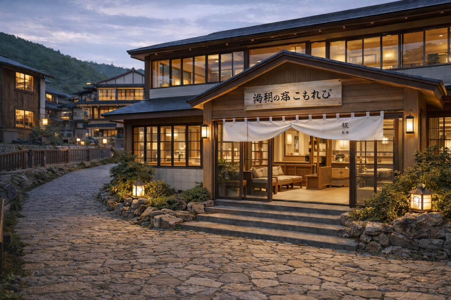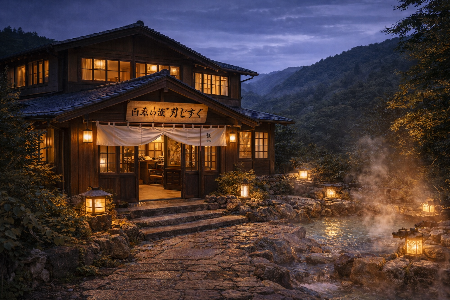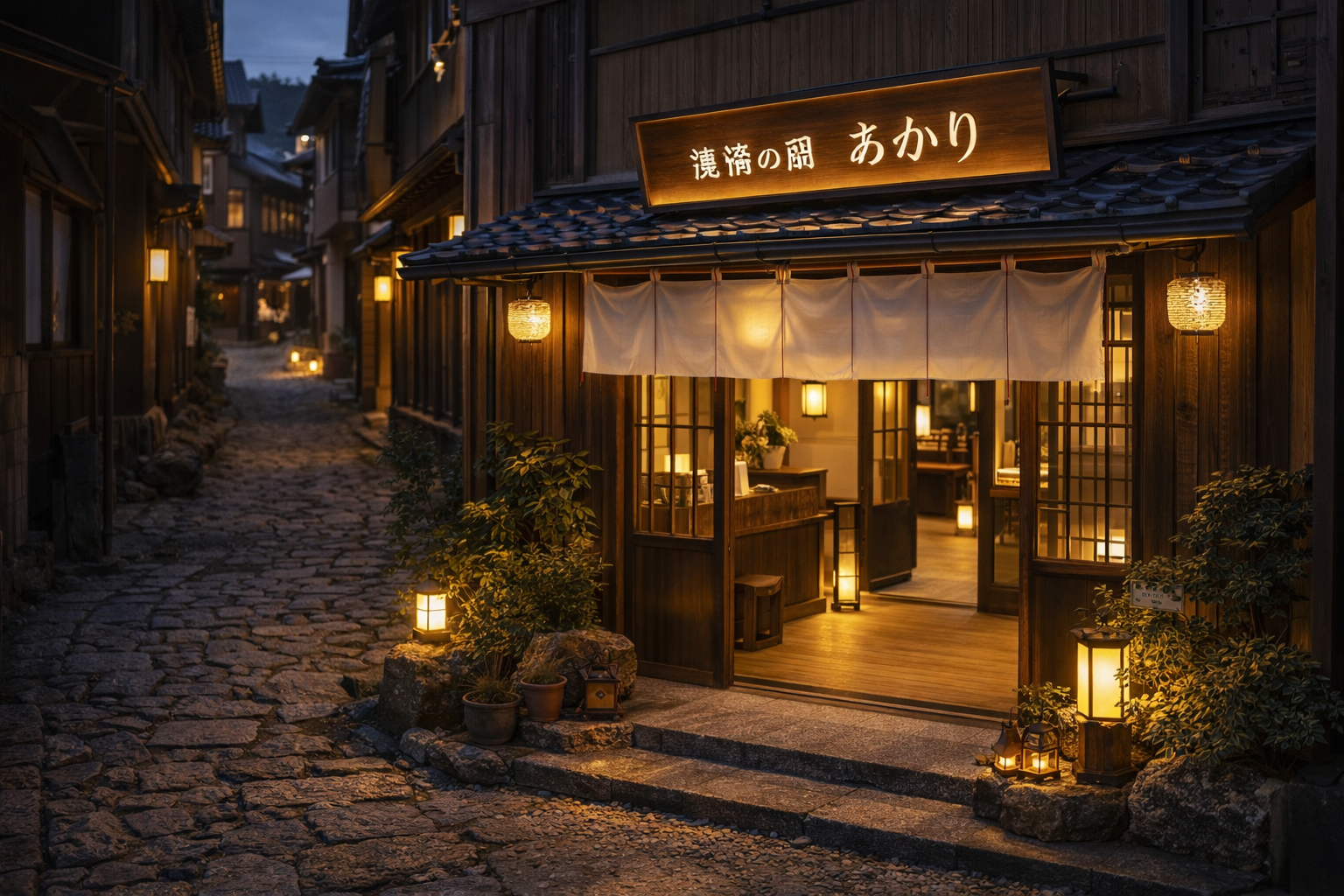 温泉街の路地に佇む小さな和モダン旅館。間接照明が印象的な館内で、夜の草津をゆったり楽しめる大人の隠れ宿です。