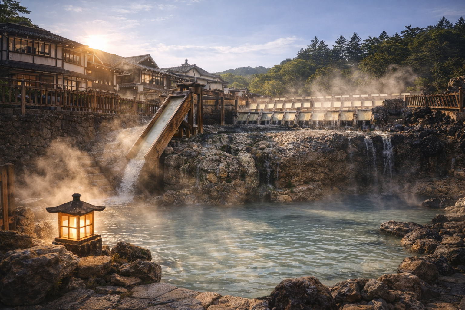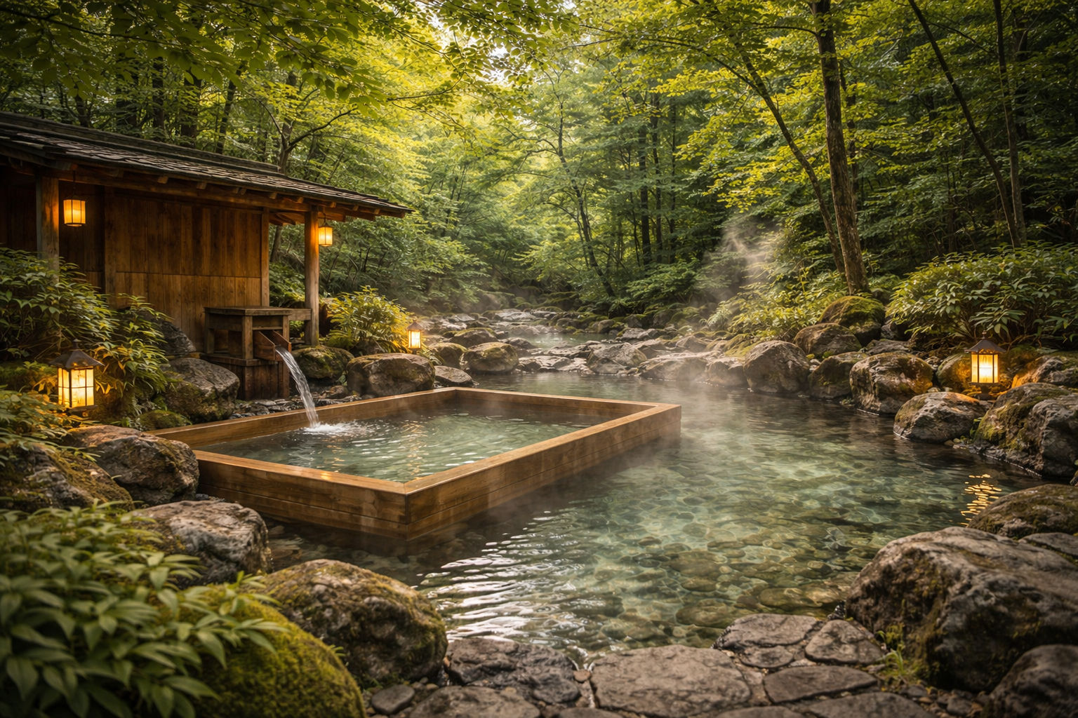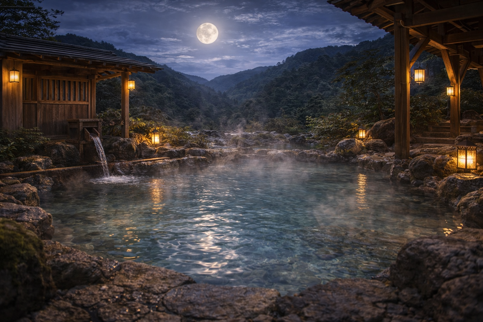 夜空と湯けむりが溶け合う落ち着いた温泉。静かな時間帯に訪れれば、草津の名湯をじっくりと堪能できる贅沢な空間です。